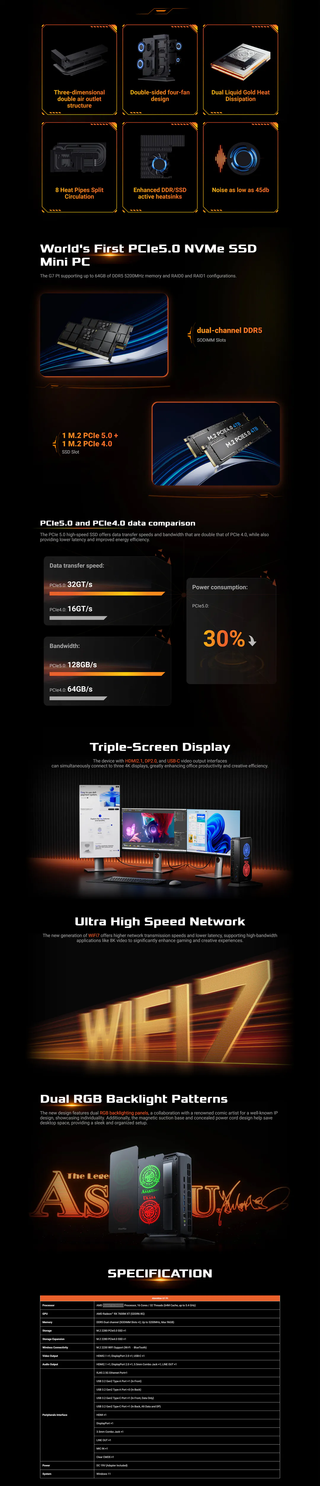 AMD Ryzen™ 9 7945HX Processor AMD Radeon RX7600M XT GPU Dual channel DDR5 memory : 0GB / 32GB / 64GB HDMI (2.1) x 1, DisplayPort (2.0) x 1 USB Type-C x 1 Support triple displays, up to 8K PCIe 5.0 & PCIe 4.0 SSD slots Storage : 0TB or 1TB 2.5Gb LAN, WiFi-7, Bluetooth 5.4 Dual RGB backlighting panels