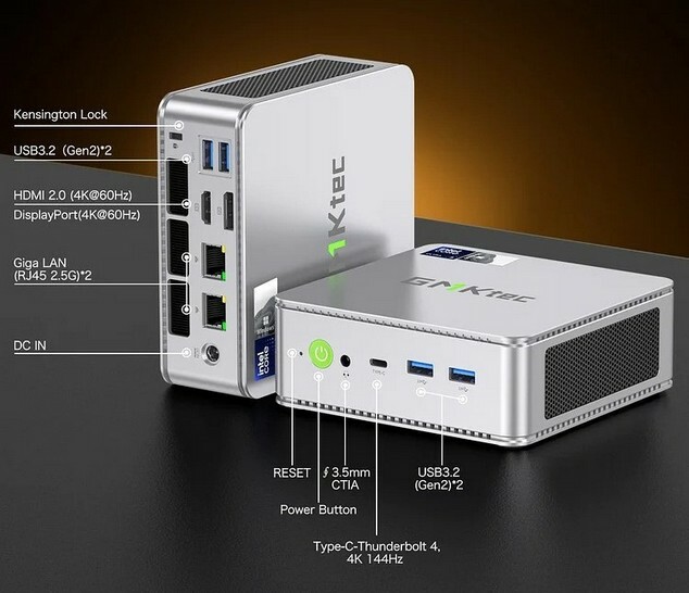 GMKtec NucBox K9 Intel® Core™ Ultra 125H (2年本地保修) USB-A 3.2*4 (Gen2 10Gbps) HDMI 2.0 (4K@60Hz*1) DisplayPort(4K@144Hz*1) Thunderbolt 4*1 3.5mm headphone jack *1 DC IN 5525 Giga LAN (RJ45) 2.5G *2 128.8 x 127 x 47.8mm